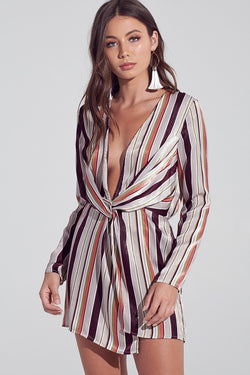 Fashion Multi-Color Striped Deep V-Neck Knot Dress