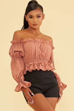 Fashion Off Shoulder Blush Textured Ruffle Top with Long Sleeve