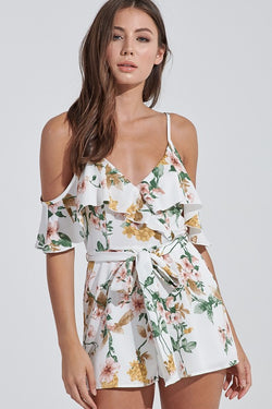 Fashion Strap Ivory Multi-Color Floral Print Tie-Up Ruffle Sleeveless Romper