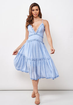 Fashion Strap Steel Blue V-Neck Ruffle Summer Dress