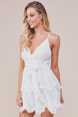 Fashion Strap White Ruffle Tie-Up Texture Detailed Dress