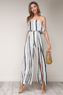 Fashion Strapless Ruffle White Striped Cut Out Jumpsuit