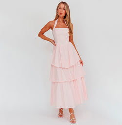 Fashion Summer Halter Pink Layered Ruffle Corset Open Back Maxi Dress
