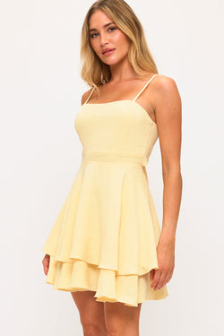 Embrace effortless summer elegance with this charming mini dress, designed for those who appreciate refined simplicity. The delicate spaghetti straps and soft baby yellow hue create a fresh, understated aesthetic, while the back tie-up detail adds an unexpected touch of sophistication. Tiered ruffle accents provide gentle movement and dimension, making this piece perfect for warm-weather occasions. Whether styled casually or dressed up for an evening out, this dress delivers versatile appeal with a polished sensibility.