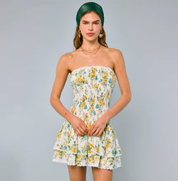 Brighten your summer days with this playful strapless mini dress featuring a cheerful yellow floral print. The elastic, ruffle-layered design adds a flirty bounce, while delicate lace details bring a touch of charm. Perfect for sunny outings or casual parties, this tube dress combines comfort and style effortlessly.
