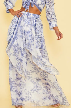 Fashion White Blue Floral Print High Waisted Ruffle Maxi Skirt