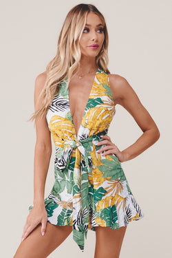 Fashion White Multi-Color Tropical Print Halter Cross Tie-Up Romper