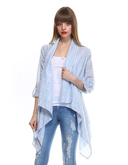 Light Blue Roll Up Sleeves Checkered Cardigan