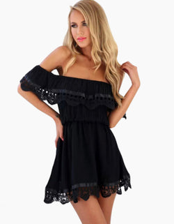 Off The Shoulder Ruffle Crochet Mini Dress Black